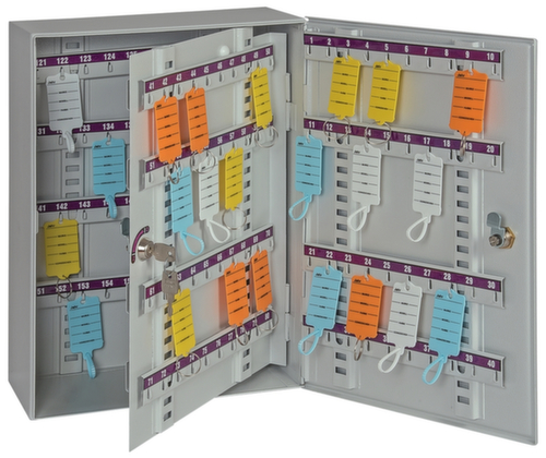 équipé de barre à crochets ajustable selon les besoins et à numérotation continue pour une disposition pratique des clés. Grâce à la porte battante, vous disposez à la fois d’un stockage à l’abri de la poussière et d’une bonne vue d’ensemble. verrouillable avec serrure à cylindre. verrouillage 1 côté. structure en tôle d'acier. corps avec finition époxy résistante aux chocs et aux rayures en RAL7035 gris clair. face avant avec finition époxy résistante aux chocs et aux rayures en RAL7035 gris clair. Préparé pour ancrage de la paroi arrière.