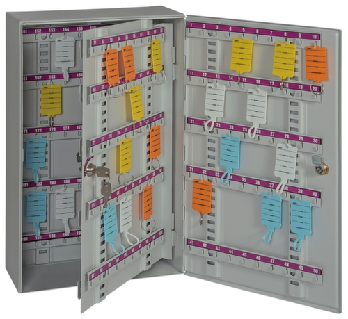 équipé de barre à crochets ajustable selon les besoins et à numérotation continue pour une disposition pratique des clés. Grâce à la porte battante, vous disposez à la fois d’un stockage à l’abri de la poussière et d’une bonne vue d’ensemble. verrouillable avec serrure à cylindre. verrouillage 1 côté. structure en tôle d'acier. corps avec finition époxy résistante aux chocs et aux rayures en RAL7035 gris clair. face avant avec finition époxy résistante aux chocs et aux rayures en RAL7035 gris clair. Préparé pour ancrage de la paroi arrière.