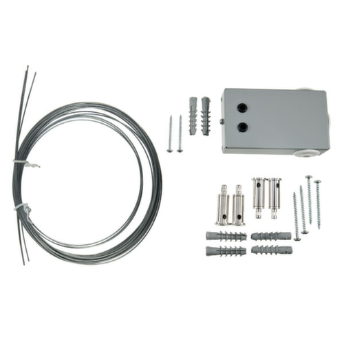 "description": "p. Panneau cubique issues de secours, 4 câbles métalliques, 8 cylindres, 1 boîtier de raccordement, 1 câble électrique, chevilles, vis, montage plafond, L 3000mm, acier",