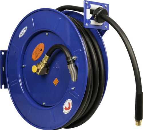 "longDescription": "<h2>Ouvrir l'enrouleur de tuyau</h2><strong>avec bras de sortie flexible pour diverses options de montage</strong><br><ul><li>Minimise l'abrasion du tuyau grâce à 4 rouleaux de guidage</li><li>Convient pour des applications jusqu'à 20 bars</li><li>Robuste et résistant aux rayures - en acier avec revêtement en poudre </li><li>Equipé - tuyau en caoutchouc inclus</li><li>Tuyau adapté à des températures allant jusqu'à 100°C</li><li>Construction durable grâce à un ressort d'entraînement encapsulé et lubrifié en permanence.</li></ul>",