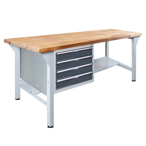 piètement 4 pieds. Équipement : 4 tiroirs, 1 tablette. hauteur des tiroirs 4x100 mm. dimension utile tiroirs largeur x profondeur 450 x 610 mm. force par tiroir 60 kg. tiroirs Les tiroirs s'ouvrent et se ferment facilement et silencieusement grâce aux glissières à galets. Elles garantissent un excellent confort d'utilisation, extension 90 %. avec Blocage d’extension. Le blocage permet d’éviter une extraction complète accidentelle de tous les tiroirs. Tous les tiroirs sont dotés d'une poignée barre sur toute la largeur qui en facilite l'accès depuis n'importe quel angle au quotidien. La bande de papier amovible couchée sous un film transparent protecteur sur la poignée barre permet de réaliser des inscriptions personnalisées qui peuvent être adaptées à tout moment. structure en tube d’acier carré de 50 x 50 mm, soudé de manière stable. Cela rend la structure particulièrement robuste et résistante, et donc plus durable. Les coins et les angles soudés du corps garantissent une plus grande étanchéité et donc une meilleure protection contre la poussière, l’humidité et la saleté qu’une structure vissée. En outre, il n’est pas nécessaire de procéder à des travaux d’entretien réguliers ni à des réajustements. châssis avec finition époxy résistante aux chocs et aux rayures en RAL7035 gris clair. face avant avec finition époxy résistante aux chocs et aux rayures en RAL7016 gris anthracite.