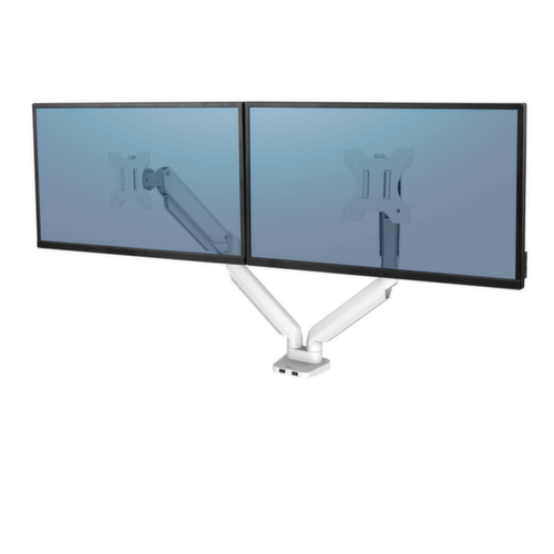 "metaDescription": "Fellowes Double bras porte-écran Platinum Series pour écran 32\" x2 - p. écran 32\"x2,2ports USB, a. fixation de table, H 135-415mm, blanc",