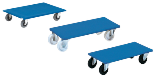 "description": "force 300kg, plateau Lxl 600x350mm, panneau contreplaqué, structure coloris bleu, 4 roulettes pivotantes, bandage caoutchouc plein",