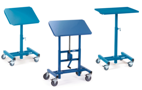 "description": "force 250kg, plateau Lxl 750x450mm, plateforme en acier, a. bord, plateforme inclinable, RAL5007, H 720-1080mm, bandage TPE",