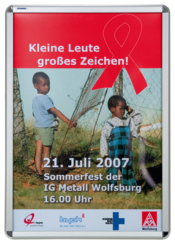 "longDescription": "<h2>Cadre de fixation</h2><strong>Présenter des informations bien protégées</strong><br><ul><li><strong>Design moderne</strong> - Cadre en aluminium anodisé argent avec coins en plastique brillants et arrondis</li><li><strong>Grande visibilité</strong> grâce au film antireflet</li><li><strong>Confère de la stabilité</strong> - Paroi arrière en polystyrène</li><li><strong>S’adapte à chaque paroi</strong> - Montage possible en format vertical ou horizontal</li></ul><br>Cet élégant cadre convient parfaitement à la présentation d'informations et d'annonces, aux portraits d'entreprise ou aux séances de photos spéciales en intérieur. Grâce à la technologie du profilé de serrage, vous pouvez changer le contenu rapidement et facilement. Le cadre est en aluminium anodisé argenté avec des coins en plastique brillant.<br><br>Grâce au film de protection anti-reflet, vos avis sont faciles à voir même en cas de lumière défavorable. En outre, le film est doté d'un filtre UV, qui protège le contenu de la décoloration. La paroi arrière de ce cadre à clipser est fabriquée en polystyrène robuste.<br><br><strong>Bon à savoir !</strong><br>Vous pouvez accrocher le cadre à la verticale ou à l'horizontale. Pour le montage mural, il vous faut des vis et des chevilles (non comprises dans le volume de livraison).<br>",