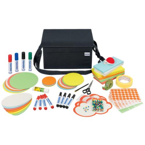 "longDescription": "<h2>Franken sacoche de conférencier</h2><h3>l'aide pratique dans le domaine des conférences</h3><p>Parfait pour les formateurs et les animateurs mobiles et pour l'organisation de séminaires, de présentations, d'ateliers ou de formations. L'équipement de présentation complet fournit non seulement une aide lors de la présentation, mais il peut également vous donner des idées lors de la préparation. Il permet d'élaborer une structure de base de la présentation. </p><strong>Caractéristiques et détails importants de Franken l'équipement de présentation</strong><ul><strong>kit comprenant :</strong> <ul><li>20 mini symboles nuage, 14x23 cm</li><li> 500 cartes rectangulaires, 9,5x20,5 cm</li><li> 200 ovales, 11x19 cm</li><li> 200 cercles, Ø 9,5 cm</li><li> 150 cercles, Ø 14 cm</li><li> 150 cercles, Ø 19,5 cm</li><li> 520 points de marquage rouges et 520 verts</li><li> 8 marqueurs pour chevalet de conférence, 4 noirs et 4 rouges</li><li> 4 marqueurs Jumbo, un rouge, un vert, un bleu et un noir,</li><li> 1 ruban de masquage</li><li> 1 dévidoir pour ruban adhésif</li><li> 2 bâtons de colle</li><li> 300 punaises à tête ronde</li><li> 1 pelote à épingles</li><li> 1 baguette de pointage</li><li> 1 paire de ciseaux</li><li> 1 cutter</li></ul></ul><p>Le compartimentage pratique est amovible et pliable. Il offre stabilité et transparence sur le contenu. anse. </p><li>hauteur x largeur x profondeur 230 x 355 x 200 mm</li><li>en anthracite</li>",