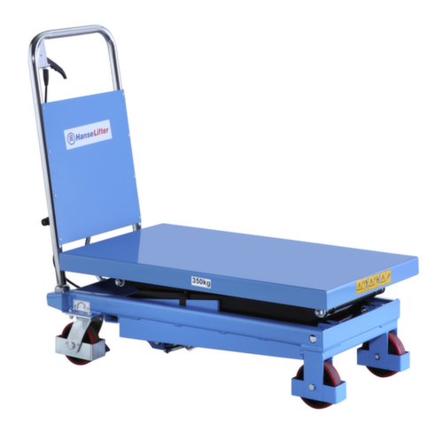 en acier avec finition époxy résistante aux chocs et aux rayures coloris RAL 5012 bleu clair. exécution de la levée manuellement par pédale. cisaille double en acier avec finition époxy résistante aux chocs et aux rayures en noir. structure acierrigide. Avec poignée. 2 roulettes pivotantes et 2 roulettes fixes avec bandage polyuréthane. Les freins situés sur deux roulettes pivotantes offrent la stabilité souhaitée à tout moment.