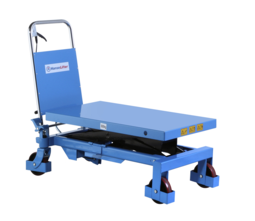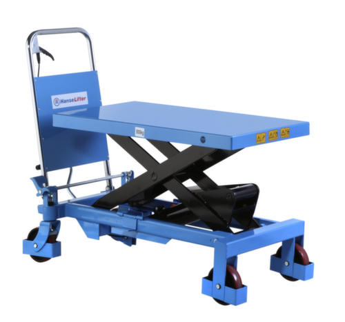 en acier avec finition époxy résistante aux chocs et aux rayures coloris RAL 5012 bleu clair. exécution de la levée manuellement par pédale. cisaille simple en acier avec finition époxy résistante aux chocs et aux rayures en noir. structure acierrigide. Avec poignée. 2 roulettes pivotantes et 2 roulettes fixes avec bandage polyuréthane. Les freins situés sur deux roulettes pivotantes offrent la stabilité souhaitée à tout moment.