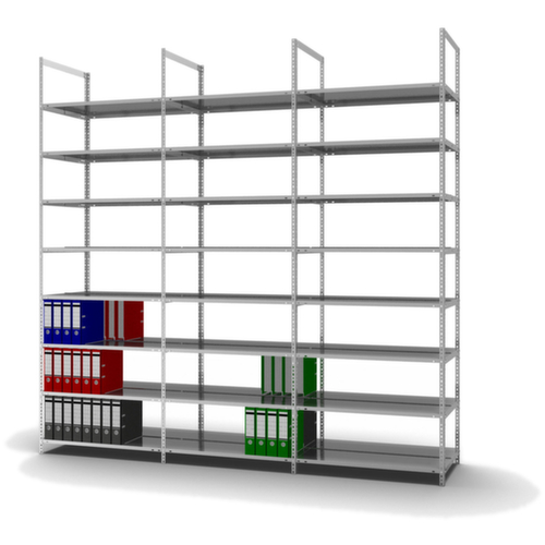 les principales dimensions du hofe rayonnage pour classeurs en un coup d’œil :8 niveau(x) avec tablettes en tôle fine de qualité, sans plateau de recouvrement / 8 hauteurs de classeur pour 96 classeurs. niveaux avec rebord antichute central emboîtable et rebord de tablette latéral du niveau supérieur (sans traverses supplémentaires) pour empêcher la chute des classeurs tout en assurant une stabilité inégalée dans le sens de la longueur et de la profondeur. Le rebord de sécurité protège en plus des blessures lorsqu'on introduit la main dans le rayonnage. utilisation bilatéral - possibilité d’installation flexible librement dans la pièce. structure en acier, montants avec revêtement en zinc anti-corrosion, niveaux avec revêtement en zinc anti-corrosion.