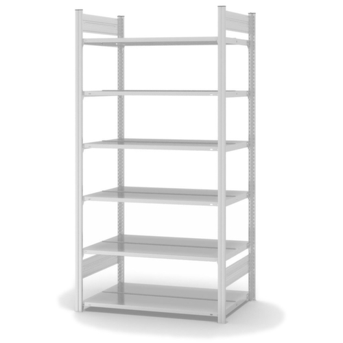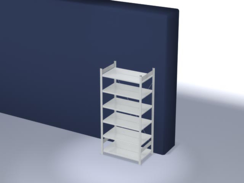 rayonnage de base avec 2 échelles, traverses raidisseuses et plateaux conf. à l’offre