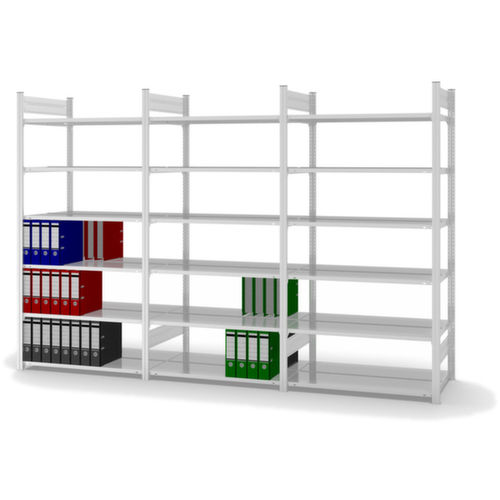 les principales dimensions du hofe du hofe rayonnage sans boulons en un coup d’œil :Vous pourrez organiser au mieux vos dossiers, classeurs et autres outils de bureau sur 6 niveau(x) avec tablettes en tôle d’acier / 6 hauteurs de classeur. niveaux avec rebord antichute central emboîtable et rebord de tablette latéral du niveau supérieur pour éviter les chutes de classeurs. hauteurs de compartiments réglables par pas de 25 mm selon l’usage prévu et vos besoins. utilisation bilatéral - possibilité d’installation flexible librement dans la pièce. Stabilité élevée grâce aux traverses de raidissement. structure en acier. montants galvanisé avec revêtement en plastique en RAL7035 gris clair. niveaux galvanisé avec revêtement en plastique en RAL7035 gris clair.