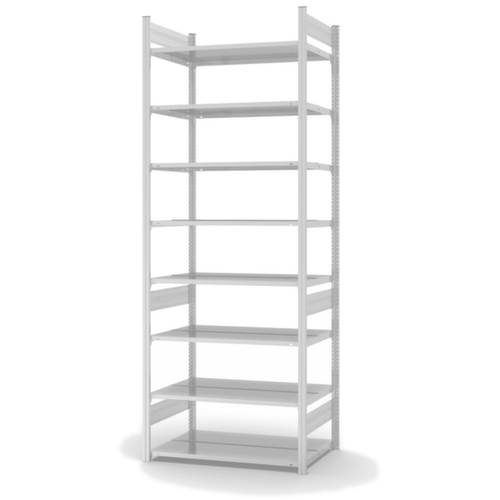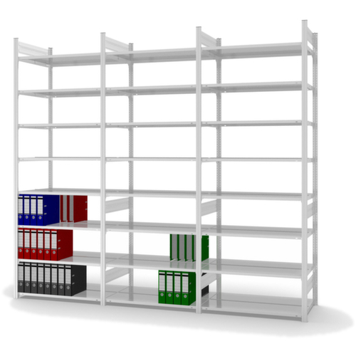 les principales dimensions du hofe du hofe rayonnage sans boulons en un coup d’œil :Vous pourrez organiser au mieux vos dossiers, classeurs et autres outils de bureau sur 8 niveau(x) avec tablettes en tôle d’acier / 8 hauteurs de classeur. niveaux avec rebord antichute central emboîtable et rebord de tablette latéral du niveau supérieur pour éviter les chutes de classeurs. hauteurs de compartiments réglables par pas de 25 mm selon l’usage prévu et vos besoins. utilisation bilatéral - possibilité d’installation flexible librement dans la pièce. Stabilité élevée grâce aux traverses de raidissement. structure en acier. montants galvanisé avec revêtement en plastique en RAL7035 gris clair. niveaux galvanisé avec revêtement en plastique en RAL7035 gris clair.