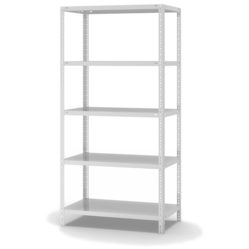 les principales dimensions du hofe rayonnage de stockage en un coup d’œil :5 niveaux avec tablette en acier. 3 pliages de sécurité de 40 mm de hauteur et avec des coins pleins garantissent un degré élevé de stabilité et de protection contre les blessures. hauteurs de compartiments réglables par pas de 25 mm selon l’usage prévu et vos besoins. utilisation unilatéral - conçu pour un montage mural. structure en acier, montants galvanisé avec revêtement en plastique en RAL7035 gris clair, niveaux galvanisé avec revêtement en plastique en RAL7035 gris clair.