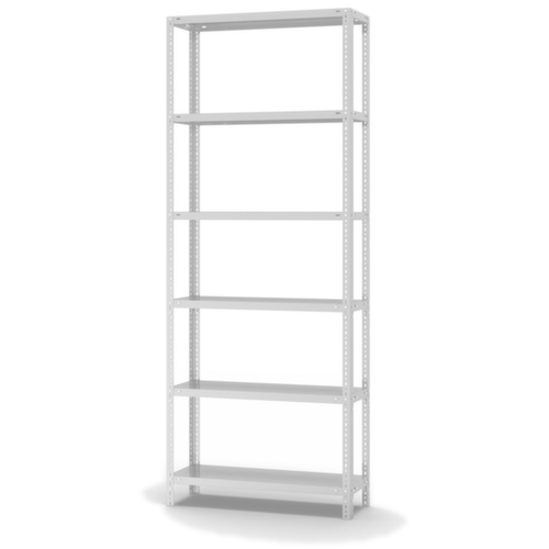 les principales dimensions du hofe rayonnage de stockage en un coup d’œil :6 niveaux avec tablette en acier. 3 pliages de sécurité de 40 mm de hauteur et avec des coins pleins garantissent un degré élevé de stabilité et de protection contre les blessures. hauteurs de compartiments réglables par pas de 25 mm selon l’usage prévu et vos besoins. utilisation unilatéral - conçu pour un montage mural. structure en acier, montants galvanisé avec revêtement en plastique en RAL7035 gris clair, niveaux galvanisé avec revêtement en plastique en RAL7035 gris clair.