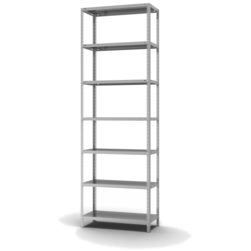 les principales dimensions du hofe rayonnage de stockage en un coup d’œil :7 niveaux avec tablette en acier. 3 pliages de sécurité de 40 mm de hauteur et avec des coins pleins garantissent un degré élevé de stabilité et de protection contre les blessures. hauteurs de compartiments réglables par pas de 25 mm selon l’usage prévu et vos besoins. utilisation unilatéral - conçu pour un montage mural. structure en acier, montants avec revêtement en zinc anti-corrosion, niveaux avec revêtement en zinc anti-corrosion.
