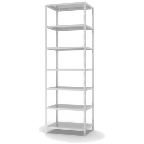 les principales dimensions du hofe rayonnage de stockage en un coup d’œil :7 niveaux avec tablette en acier. 3 pliages de sécurité de 40 mm de hauteur et avec des coins pleins garantissent un degré élevé de stabilité et de protection contre les blessures. hauteurs de compartiments réglables par pas de 25 mm selon l’usage prévu et vos besoins. utilisation unilatéral - conçu pour un montage mural. structure en acier, montants galvanisé avec revêtement en plastique en RAL7035 gris clair, niveaux galvanisé avec revêtement en plastique en RAL7035 gris clair.