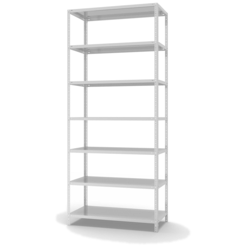 les principales dimensions du hofe rayonnage de stockage en un coup d’œil :7 niveaux avec tablette en acier. 3 pliages de sécurité de 40 mm de hauteur et avec des coins pleins garantissent un degré élevé de stabilité et de protection contre les blessures. hauteurs de compartiments réglables par pas de 25 mm selon l’usage prévu et vos besoins. utilisation unilatéral - conçu pour un montage mural. structure en acier, montants galvanisé avec revêtement en plastique en RAL7035 gris clair, niveaux galvanisé avec revêtement en plastique en RAL7035 gris clair.