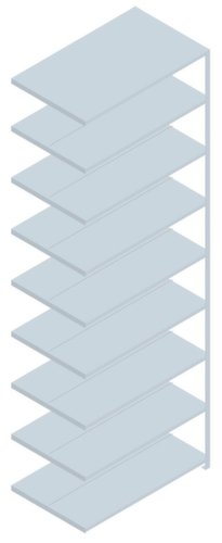 pour votre sécurité : selon DIN EN 15635, il est impératif de sécuriser et de fixer au sol les rayonnages à tablettes dont la hauteur correspond au moins à quatre fois la profondeur du rayonnage (rapport 4:1). les charges max. par tablette indiquées s’entendent pour une répartition uniforme de la charge. des tablettes/niveaux supplémentaires sont disponibles jusqu’à la charge max. par élément.