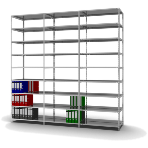 les principales dimensions du hofe rayonnage pour classeurs en un coup d’œil :9 niveau(x) avec tablettes en tôle fine de qualité, dont 1 plateau de recouvrement / 8 hauteurs de classeur pour 108 classeurs. niveaux avec rebord antichute central emboîtable et rebord de tablette latéral du niveau supérieur (sans traverses supplémentaires) pour empêcher la chute des classeurs tout en assurant une stabilité inégalée dans le sens de la longueur et de la profondeur. Le rebord de sécurité protège en plus des blessures lorsqu'on introduit la main dans le rayonnage. utilisation bilatéral - possibilité d’installation flexible librement dans la pièce. structure en acier, montants avec revêtement en zinc anti-corrosion, niveaux avec revêtement en zinc anti-corrosion.