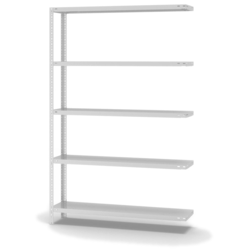 les principales dimensions du hofe rayonnage de stockage en un coup d’œil :5 niveaux avec tablette en acier. 3 pliages de sécurité de 40 mm de hauteur et avec des coins pleins garantissent un degré élevé de stabilité et de protection contre les blessures. hauteurs de compartiments réglables par pas de 25 mm selon l’usage prévu et vos besoins. utilisation unilatéral - conçu pour un montage mural. structure en acier, montants galvanisé avec revêtement en plastique en RAL7035 gris clair, niveaux galvanisé avec revêtement en plastique en RAL7035 gris clair.