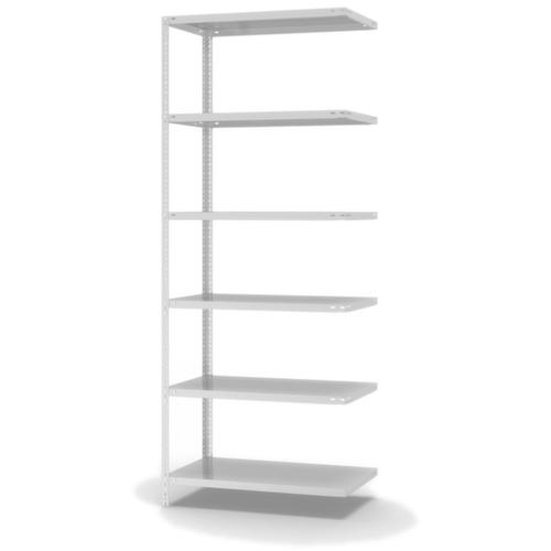 les principales dimensions du hofe rayonnage de stockage en un coup d’œil :6 niveaux avec tablette en acier. 3 pliages de sécurité de 40 mm de hauteur et avec des coins pleins garantissent un degré élevé de stabilité et de protection contre les blessures. hauteurs de compartiments réglables par pas de 25 mm selon l’usage prévu et vos besoins. utilisation unilatéral - conçu pour un montage mural. structure en acier, montants galvanisé avec revêtement en plastique en RAL7035 gris clair, niveaux galvanisé avec revêtement en plastique en RAL7035 gris clair.