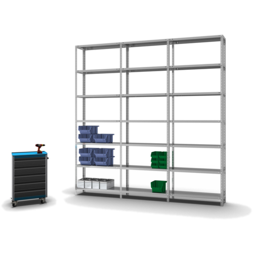 les principales dimensions du hofe rayonnage de stockage en un coup d’œil :7 niveaux avec tablette en acier. 3 pliages de sécurité de 40 mm de hauteur et avec des coins pleins garantissent un degré élevé de stabilité et de protection contre les blessures. hauteurs de compartiments réglables par pas de 25 mm selon l’usage prévu et vos besoins. utilisation unilatéral - conçu pour un montage mural. structure en acier, montants avec revêtement en zinc anti-corrosion, niveaux avec revêtement en zinc anti-corrosion.