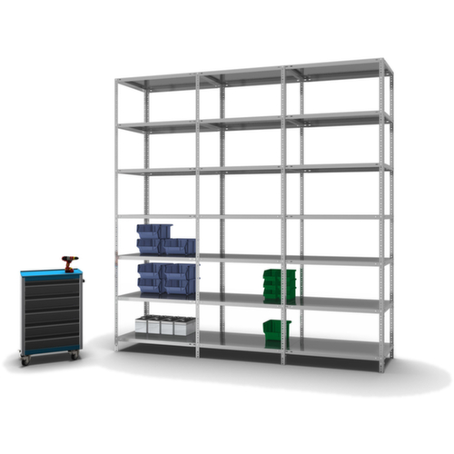 les principales dimensions du hofe rayonnage de stockage en un coup d’œil :7 niveaux avec tablette en acier. 3 pliages de sécurité de 40 mm de hauteur et avec des coins pleins garantissent un degré élevé de stabilité et de protection contre les blessures. hauteurs de compartiments réglables par pas de 25 mm selon l’usage prévu et vos besoins. utilisation unilatéral - conçu pour un montage mural. structure en acier, montants avec revêtement en zinc anti-corrosion, niveaux avec revêtement en zinc anti-corrosion.
