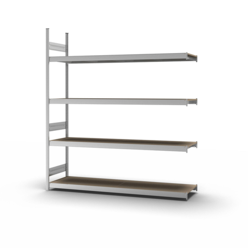 Les principales dimensions du hofe rayonnage grande largeur en un coup d’œil :4 niveaux avec sol en bois. niveaux avec renfort par poutres. hauteurs de compartiments réglables par pas de 25 mm selon l’usage prévu et vos besoins. utilisation unilatéral - conçu pour un montage mural. Les tôles de liaison en profondeur et les embases en acier confèrent une excellente stabilité au rayonnage. Les caches profilés supérieurs assurent une finition soignée. structure en acier, montants avec revêtement en zinc anti-corrosion, traverses avec revêtement en zinc anti-corrosion.