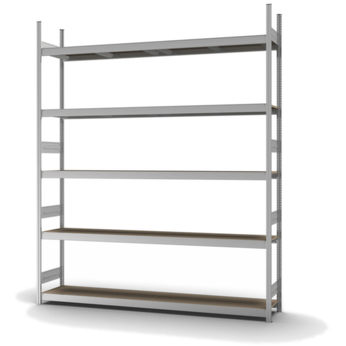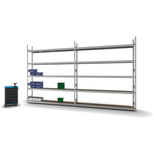 Les principales dimensions du hofe rayonnage grande largeur en un coup d’œil :5 niveaux avec sol en bois. niveaux avec renfort par poutres. hauteurs de compartiments réglables par pas de 25 mm selon l’usage prévu et vos besoins. utilisation unilatéral - conçu pour un montage mural. Les tôles de liaison en profondeur et les embases en acier confèrent une excellente stabilité au rayonnage. Les caches profilés supérieurs assurent une finition soignée. structure en acier, montants avec revêtement en zinc anti-corrosion, traverses avec revêtement en zinc anti-corrosion.