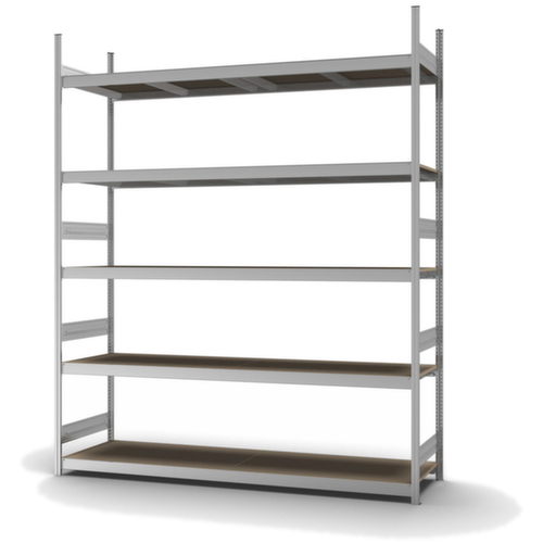 Les principales dimensions du hofe rayonnage grande largeur en un coup d’œil :5 niveaux avec sol en bois. niveaux avec renfort par poutres. hauteurs de compartiments réglables par pas de 25 mm selon l’usage prévu et vos besoins. utilisation unilatéral - conçu pour un montage mural. Les tôles de liaison en profondeur et les embases en acier confèrent une excellente stabilité au rayonnage. Les caches profilés supérieurs assurent une finition soignée. structure en acier, montants avec revêtement en zinc anti-corrosion, traverses avec revêtement en zinc anti-corrosion.