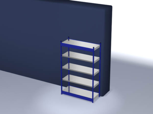 les principales dimensions du hofe rayonnage de stockage en un coup d’œil :5 niveaux avec tablette en acier. niveaux avec pliage de sécurité comme protection contre les blessures. 3 pliages de sécurité de 40 mm de hauteur garantissent un degré élevé de stabilité et de protection contre les blessures. hauteurs de compartiments réglables par pas de 50 mm selon l’usage prévu et vos besoins. angle d'installation droit. utilisation bilatéral - possibilité d’installation flexible librement dans la pièce. Stabilité élevée grâce aux traverses longitudinales. structure en acier, montants avec revêtement en plastique résistant à l’usure en RAL5010 bleu gentiane, niveaux avec revêtement en zinc anti-corrosion.