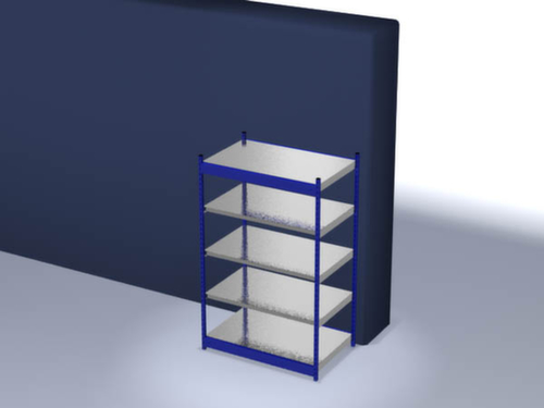 les principales dimensions du hofe rayonnage de stockage en un coup d’œil :5 niveaux avec tablette en acier. niveaux avec pliage de sécurité comme protection contre les blessures. 3 pliages de sécurité de 40 mm de hauteur garantissent un degré élevé de stabilité et de protection contre les blessures. hauteurs de compartiments réglables par pas de 50 mm selon l’usage prévu et vos besoins. angle d'installation droit. utilisation bilatéral - possibilité d’installation flexible librement dans la pièce. Stabilité élevée grâce aux traverses longitudinales. structure en acier, montants avec revêtement en plastique résistant à l’usure en RAL5010 bleu gentiane, niveaux avec revêtement en zinc anti-corrosion.