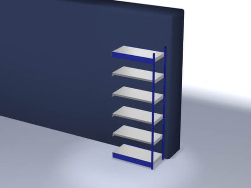 les principales dimensions du hofe rayonnage de stockage en un coup d’œil :6 niveaux avec tablette en acier. niveaux avec pliage de sécurité comme protection contre les blessures. 3 pliages de sécurité de 40 mm de hauteur garantissent un degré élevé de stabilité et de protection contre les blessures. hauteurs de compartiments réglables par pas de 50 mm selon l’usage prévu et vos besoins. angle d'installation droit. utilisation bilatéral - possibilité d’installation flexible librement dans la pièce. Stabilité élevée grâce aux traverses longitudinales. structure en acier, montants avec revêtement en plastique résistant à l’usure en RAL5010 bleu gentiane, niveaux avec revêtement en zinc anti-corrosion.