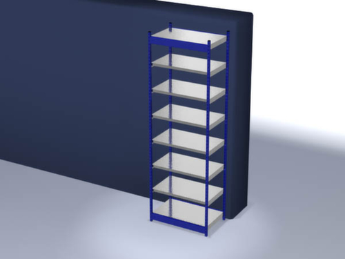 les principales dimensions du hofe rayonnage de stockage en un coup d’œil :7 niveaux avec tablette en acier. niveaux avec pliage de sécurité comme protection contre les blessures. 3 pliages de sécurité de 40 mm de hauteur garantissent un degré élevé de stabilité et de protection contre les blessures. hauteurs de compartiments réglables par pas de 50 mm selon l’usage prévu et vos besoins. angle d'installation droit. utilisation unilatéral - conçu pour un montage mural. Stabilité élevée grâce aux traverses longitudinales. structure en acier, montants avec revêtement en plastique résistant à l’usure en RAL5010 bleu gentiane, niveaux avec revêtement en zinc anti-corrosion.