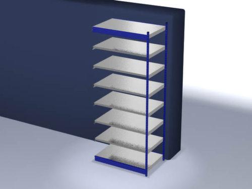 les principales dimensions du hofe rayonnage de stockage en un coup d’œil :7 niveaux avec tablette en acier. niveaux avec pliage de sécurité comme protection contre les blessures. 3 pliages de sécurité de 40 mm de hauteur garantissent un degré élevé de stabilité et de protection contre les blessures. hauteurs de compartiments réglables par pas de 50 mm selon l’usage prévu et vos besoins. angle d'installation droit. utilisation unilatéral - conçu pour un montage mural. Stabilité élevée grâce aux traverses longitudinales. structure en acier, montants avec revêtement en plastique résistant à l’usure en RAL5010 bleu gentiane, niveaux avec revêtement en zinc anti-corrosion.