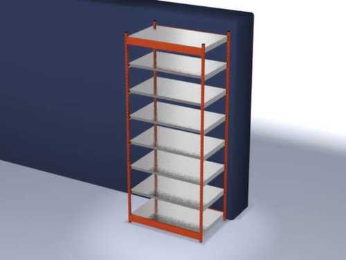 les principales dimensions du hofe rayonnage de stockage en un coup d’œil :7 niveaux avec tablette en acier. niveaux avec pliage de sécurité comme protection contre les blessures. 3 pliages de sécurité de 40 mm de hauteur garantissent un degré élevé de stabilité et de protection contre les blessures. hauteurs de compartiments réglables par pas de 50 mm selon l’usage prévu et vos besoins. angle d'installation droit. utilisation unilatéral - conçu pour un montage mural. Stabilité élevée grâce aux traverses longitudinales. structure en acier, montants avec revêtement en plastique résistant à l’usure en RAL2004 orangé pur, niveaux avec revêtement en zinc anti-corrosion.