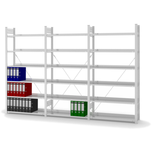 les principales dimensions du hofe du hofe rayonnage sans boulons en un coup d’œil :Vous pourrez organiser au mieux vos dossiers, classeurs et autres outils de bureau sur 6 niveau(x) avec tablettes en tôle d’acier / 6 hauteurs de classeur. niveaux avec rebord antichute et rebord de tablette latéral du niveau supérieur pour éviter les chutes de classeurs. hauteurs de compartiments réglables par pas de 25 mm selon l’usage prévu et vos besoins. utilisation unilatéral - conçu pour un montage mural. Stabilité élevée grâce aux croisillons. structure en acier. montants galvanisé avec revêtement en plastique en RAL7035 gris clair. niveaux galvanisé avec revêtement en plastique en RAL7035 gris clair.