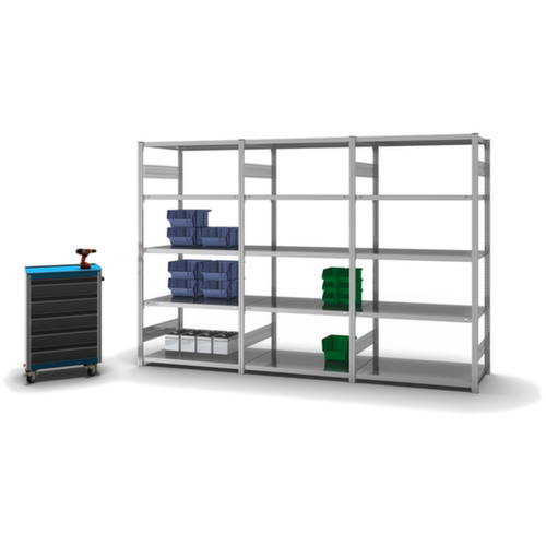 les principales dimensions du hofe rayonnage de stockage en un coup d’œil :5 niveaux avec tablette en acier. hauteurs de compartiments réglables par pas de 25 mm selon l’usage prévu et vos besoins. angle d'installation droit. utilisation bilatéral - possibilité d’installation flexible librement dans la pièce. Stabilité élevée grâce aux traverses de raidissement. Les tôles de liaison en profondeur et les embases en acier confèrent une excellente stabilité au rayonnage. Les caches profilés supérieurs assurent une finition soignée. structure en acier, montants avec revêtement en zinc anti-corrosion, niveaux avec revêtement en zinc anti-corrosion.