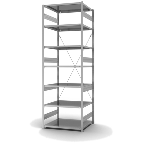 les principales dimensions du hofe rayonnage de stockage en un coup d’œil :7 niveaux avec tablette en acier. niveaux avec pliage de sécurité comme protection contre les blessures. 3 pliages de sécurité de 40 mm de hauteur et avec des coins pleins garantissent un degré élevé de stabilité et de protection contre les blessures. hauteurs de compartiments réglables par pas de 25 mm selon l’usage prévu et vos besoins. angle d'installation droit. utilisation unilatéral - conçu pour un montage mural. Stabilité élevée grâce aux croisillons. Les tôles de liaison en profondeur et les embases en acier confèrent une excellente stabilité au rayonnage. Les caches profilés supérieurs assurent une finition soignée. structure en acier, montants avec revêtement en zinc anti-corrosion, niveaux avec revêtement en zinc anti-corrosion.