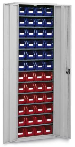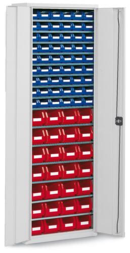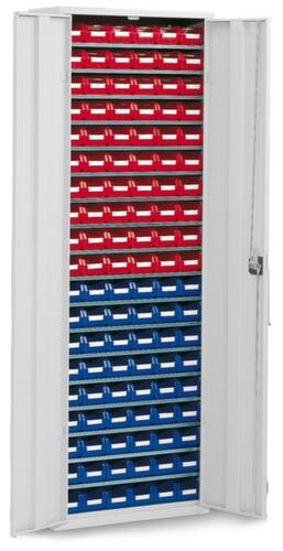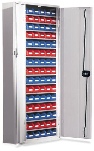 "description": "HxlxP 1950x690x285mm, corps/face avant RAL7035/RAL7035,114bacs PE, 18xtablette en acier, serr.cyl., socle",
