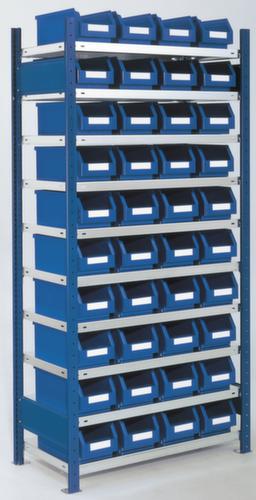 Les principales dimensions du Kappes rayonnage à bacs en un coup d’œil :Stockage clairement organisé des petites pièces sur 10 plateaux avec tablette en acier et 40 bacs. niveau(x) avec pliage de sécurité comme protection contre les blessures. utilisation unilatéral - conçu pour un montage mural. structure en acier. montants avec finition époxy résistante aux chocs et aux rayures en RAL5010 bleu gentiane.