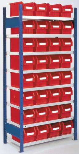 Les principales dimensions du Kappes rayonnage à bacs en un coup d’œil :Stockage clairement organisé des petites pièces sur 8 plateaux avec tablette en acier et 32 bacs. niveau(x) avec pliage de sécurité comme protection contre les blessures. utilisation unilatéral - conçu pour un montage mural. structure en acier. montants avec finition époxy résistante aux chocs et aux rayures en RAL5010 bleu gentiane.