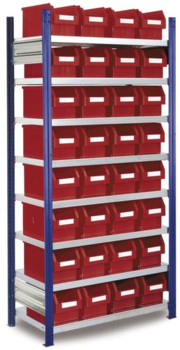 Les principales dimensions du Kappes rayonnage à bacs en un coup d’œil :Stockage clairement organisé des petites pièces sur 8 plateaux avec tablette en acier et 32 bacs. niveau(x) avec pliage de sécurité comme protection contre les blessures. utilisation unilatéral - conçu pour un montage mural. structure en acier. montants avec finition époxy résistante aux chocs et aux rayures en RAL5010 bleu gentiane.