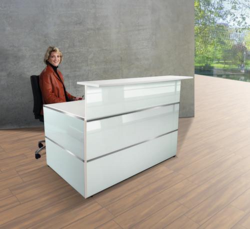 "metaDescription": "Kerkmann Banque d'accueil droite Atlantis - HxlxP 1080x1350x1015mm, panneau blanc, face avant blanc, face avant en verre",