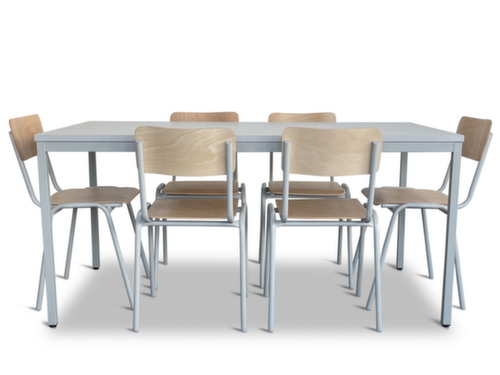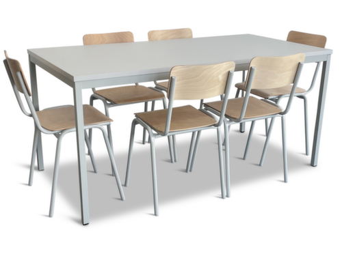 caractéristiques :assise en multiplis de hêtre en nature. dossier en multiplis de hêtre en nature. chaises avec piètement 4 pieds en acier avec laquage en gris clair. table avec piètement 4 pieds en acier avec laquage en gris. panneau en aggloméré avec revêtement mélaminé, facile d’entretien finition gris. châssis avec patins protecteurs. table hauteur x largeur x profondeur 740 x 1600 x 800 mm. Possibilité d'empiler plusieurs chaises pour un gain de place gerbable.