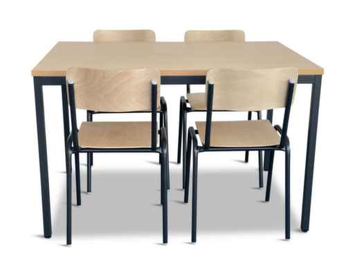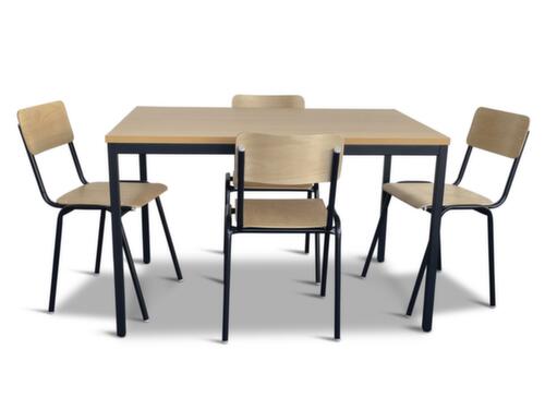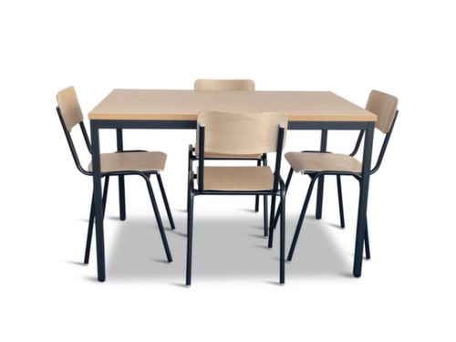 caractéristiques :assise en multiplis de hêtre en nature. dossier en multiplis de hêtre en nature. chaises avec piètement 4 pieds en acier avec laquage en noir. table avec piètement 4 pieds en acier avec laquage en noir. panneau en aggloméré avec revêtement mélaminé, facile d’entretien finition hêtre. châssis avec patins protecteurs. table hauteur x largeur x profondeur 740 x 1200 x 800 mm. Possibilité d'empiler plusieurs chaises pour un gain de place gerbable.