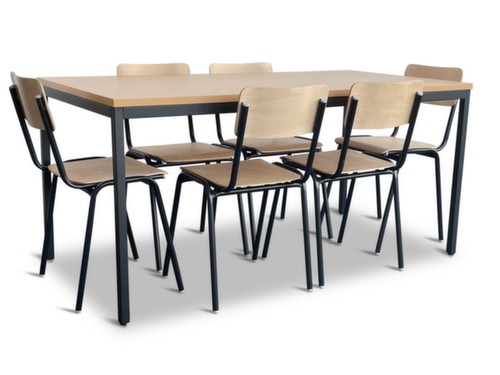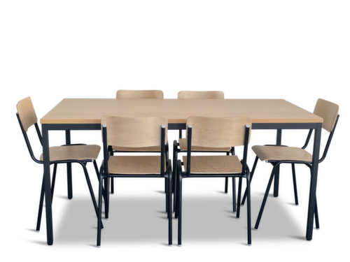 caractéristiques :assise en multiplis de hêtre en nature. dossier en multiplis de hêtre en nature. chaises avec piètement 4 pieds en acier avec laquage en noir. table avec piètement 4 pieds en acier avec laquage en noir. panneau en aggloméré avec revêtement mélaminé, facile d’entretien finition hêtre. châssis avec patins protecteurs. table hauteur x largeur x profondeur 740 x 1600 x 800 mm. Possibilité d'empiler plusieurs chaises pour un gain de place gerbable.