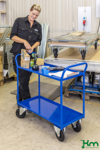 plateau(x) en acier avec finition époxy résistante aux chocs et aux rayures en bleu. plateau(x) avec rebord antichute. barre de poussée vertical. châssis avec finition époxy résistante aux chocs et aux rayures en bleu. structure en acier (à soudure fixe. Cela confère à la structure la robustesse et la stabilité nécessaires pour être à la hauteur d'une multitude de cas d'utilisation). Les 2 roulettes pivotantes et les 2 roulettes fixes intégrées permettent un déplacement aisé avec une grande stabilité de trajectoire sur les lignes droites et dans les virages ne demandant que peu d'efforts. Ø de roue 160 mm. roues avec bandage caoutchouc plein avec bandage increvable garantissant la protection du sol sur jante polypropylène robuste et incassable. boîtier en acier. disposition des roues parallèle.