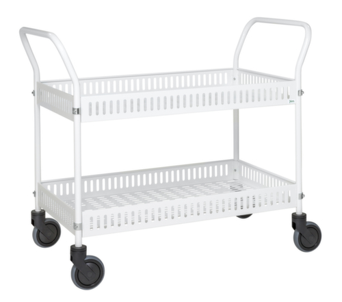 plateau(x) en tôle avec finition époxy résistante aux chocs et aux rayures en blanc. plateau(x) avec bord protecteur. hauteur du bord 90 mm. châssis avec finition époxy résistante aux chocs et aux rayures en blanc. structure en acier. Manœuvre et déplacement aisés grâce à 4 roulettes pivotantes, Les freins situés sur deux roulettes pivotantes offrent la stabilité souhaitée à tout moment. Ø de roue 125 mm. roues avec bandage TPE préservant le sol sur jante polypropylène robuste et incassable. moyeu avec roulement à billes de précision. disposition des roues rectangulaire.