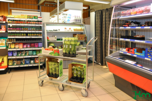 "metaTitle": "Kongamek Chariot avec barre de poussée à 2 plateaux, force 400 kg, plateau longueur x largeur 1080 x 415 mm - Chariots à étagères",